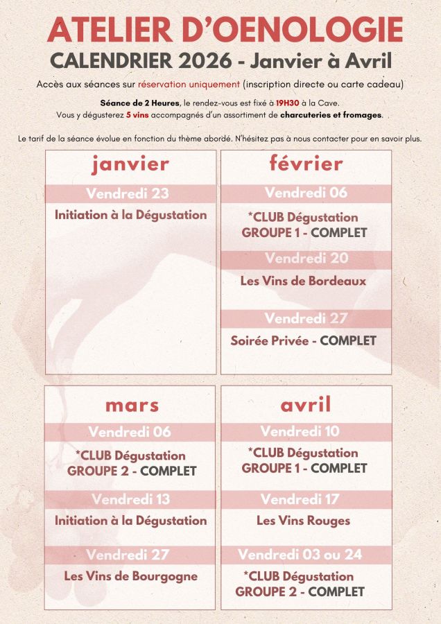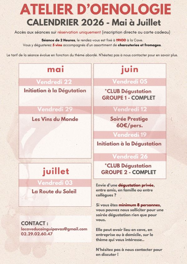 Ils ont lieu deux jeudis par mois, dans notre cave à Guipavas, et sont animés par un caviste sommelier professionnel. Sur demande et en fonction de nos disponibilités, nous pouvons également organiser des cours supplémentaires en soirée, pour groupe d’amis, famille ou collaborateurs d'entreprises..